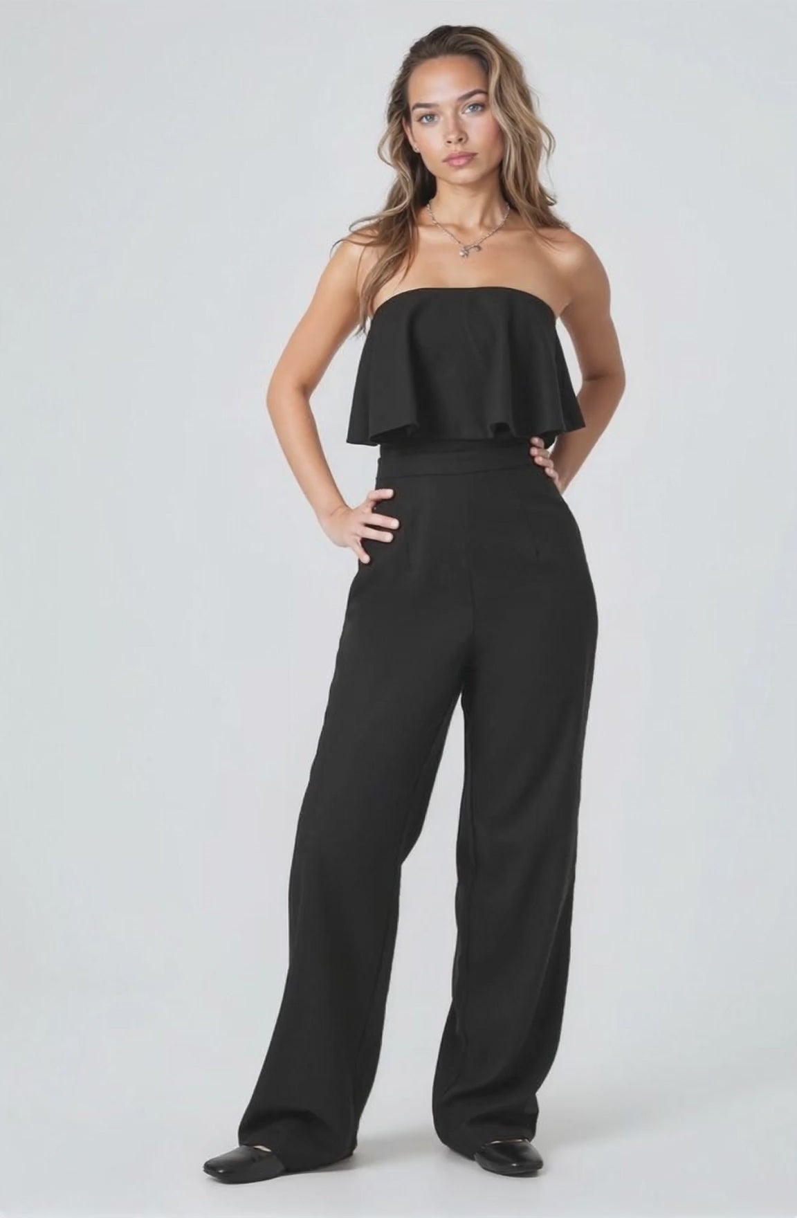 A woven tube jumpsuit featuring a flounce overlay, straight-cut neckline and back, concealed zippered back closure, and wide leg.
