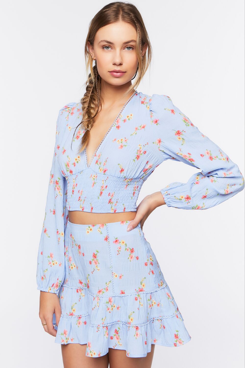 A woven set featuring a crop top with an allover floral print, a plunging V-neckline with picot trim, long peasant sleeves, and smocked hem, as well as a matching mini skirt with smocked waist, tiered design, and layered flounce hem.