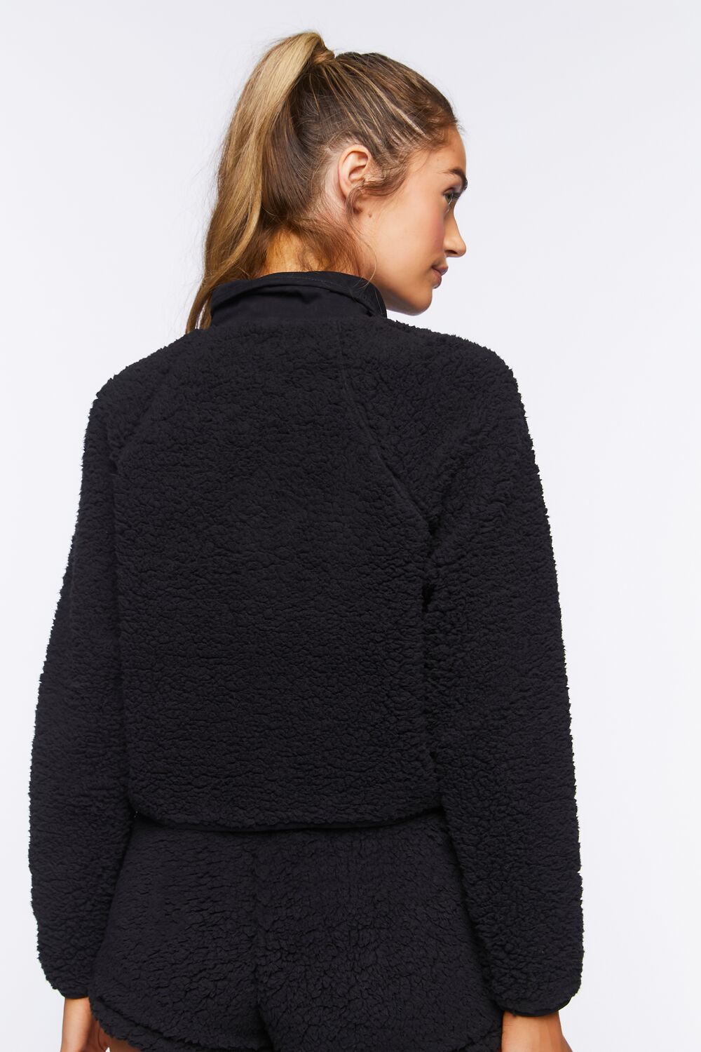 An athletic knit pullover featuring a faux shearling construction, a basic collar, partial button placket, zipper detailing, and long sleeves.
