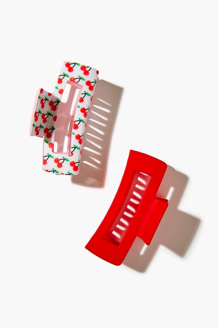 A hair claw clip set featuring solid and cherry print designs and cutout construction.