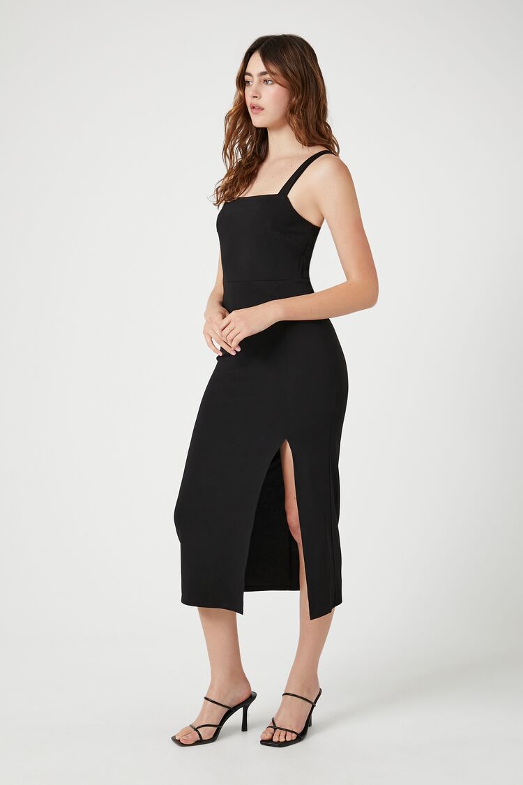 A Ponte knit midi dress featuring a square-cut neckline and back, shoulder straps, concealed back zipper, empire waist, side leg slit, and bodycon silhouette.