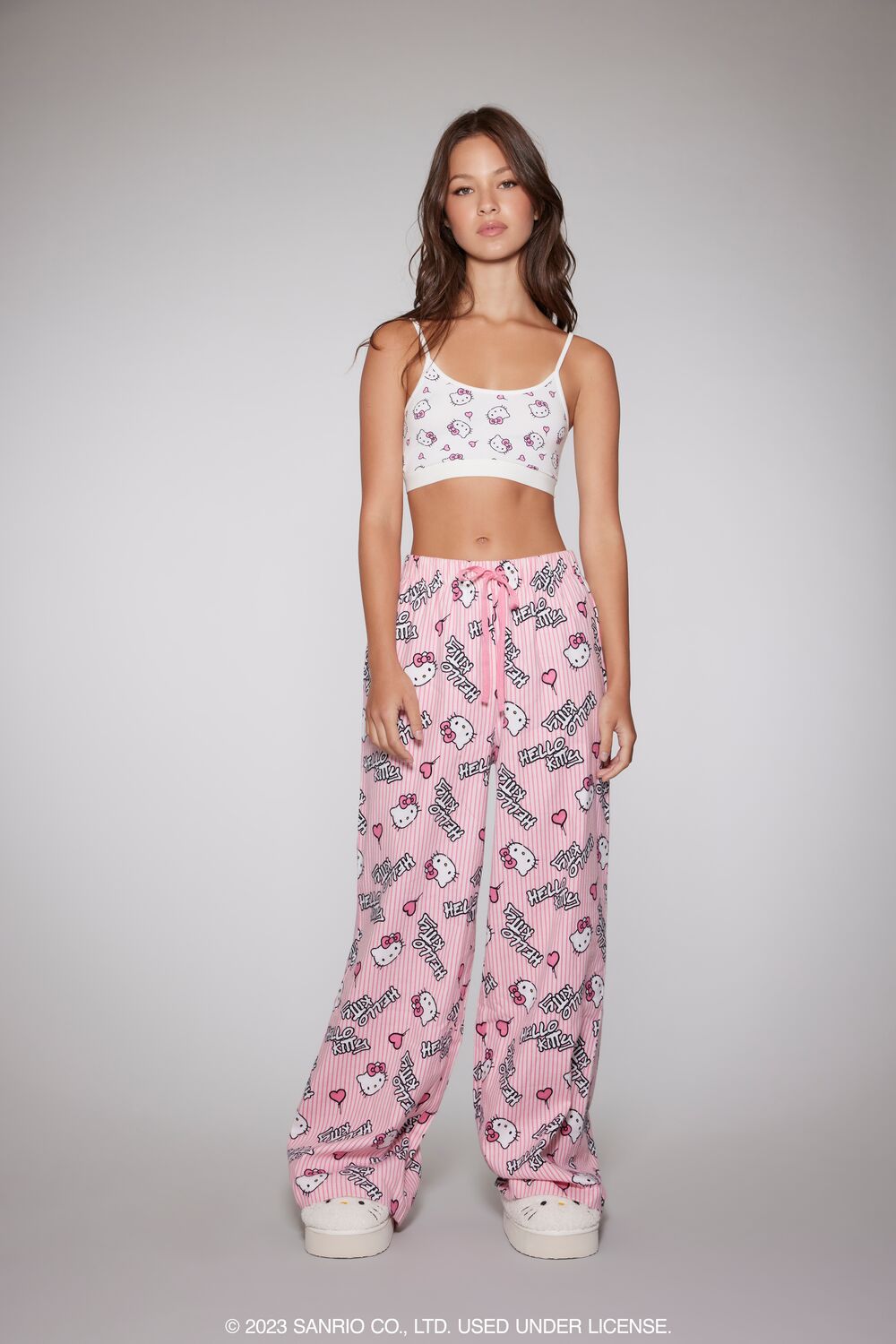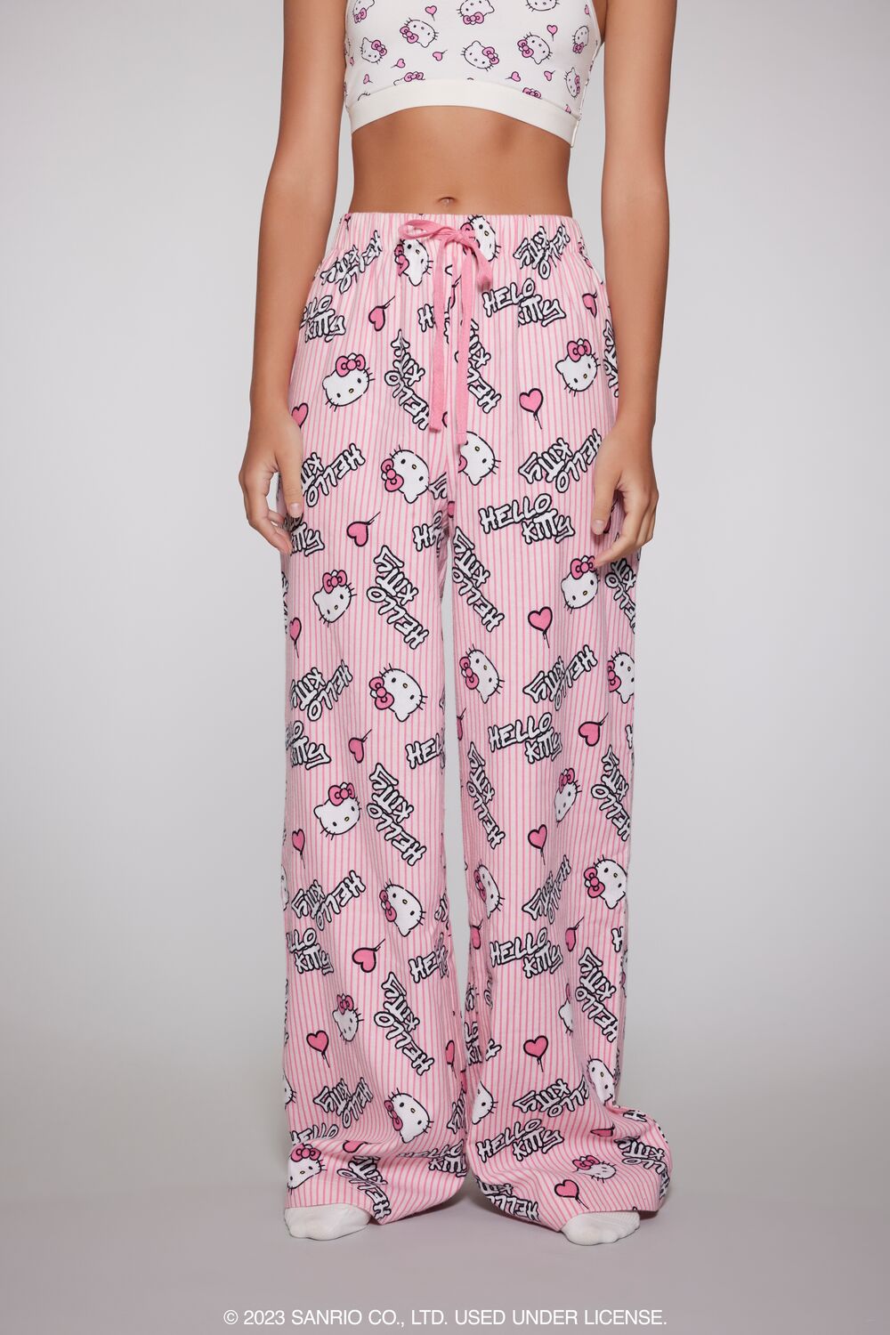 From our Hello Kitty and Friends x Forever 21 collection, this flannel pair of pajama pants features an allover striped pattern, 'Hello Kitty' text and accompanying character and heart balloon graphics, a straight leg, and drawstring waistband.
