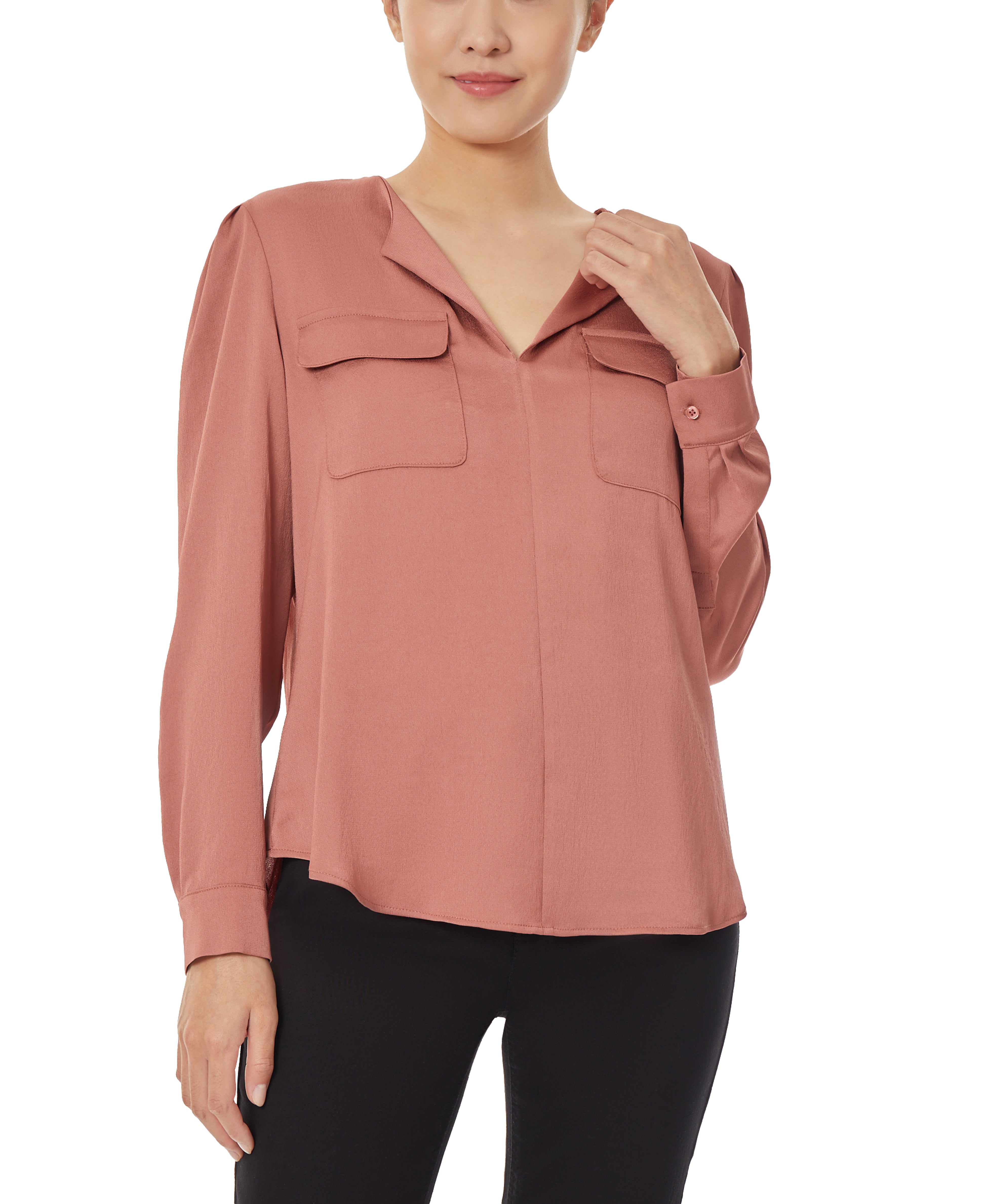 This charmeuse blouse defines effortless elegance and is a must-have staple piece for both your professional and casual wardrobes. This classic look is updated with a split neckline and front pocket details. It's so stylish that you'll want to wear it every day.